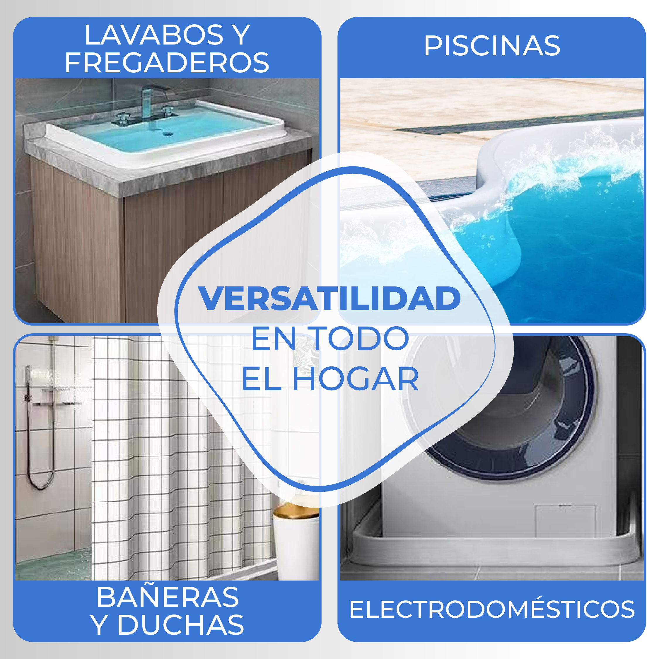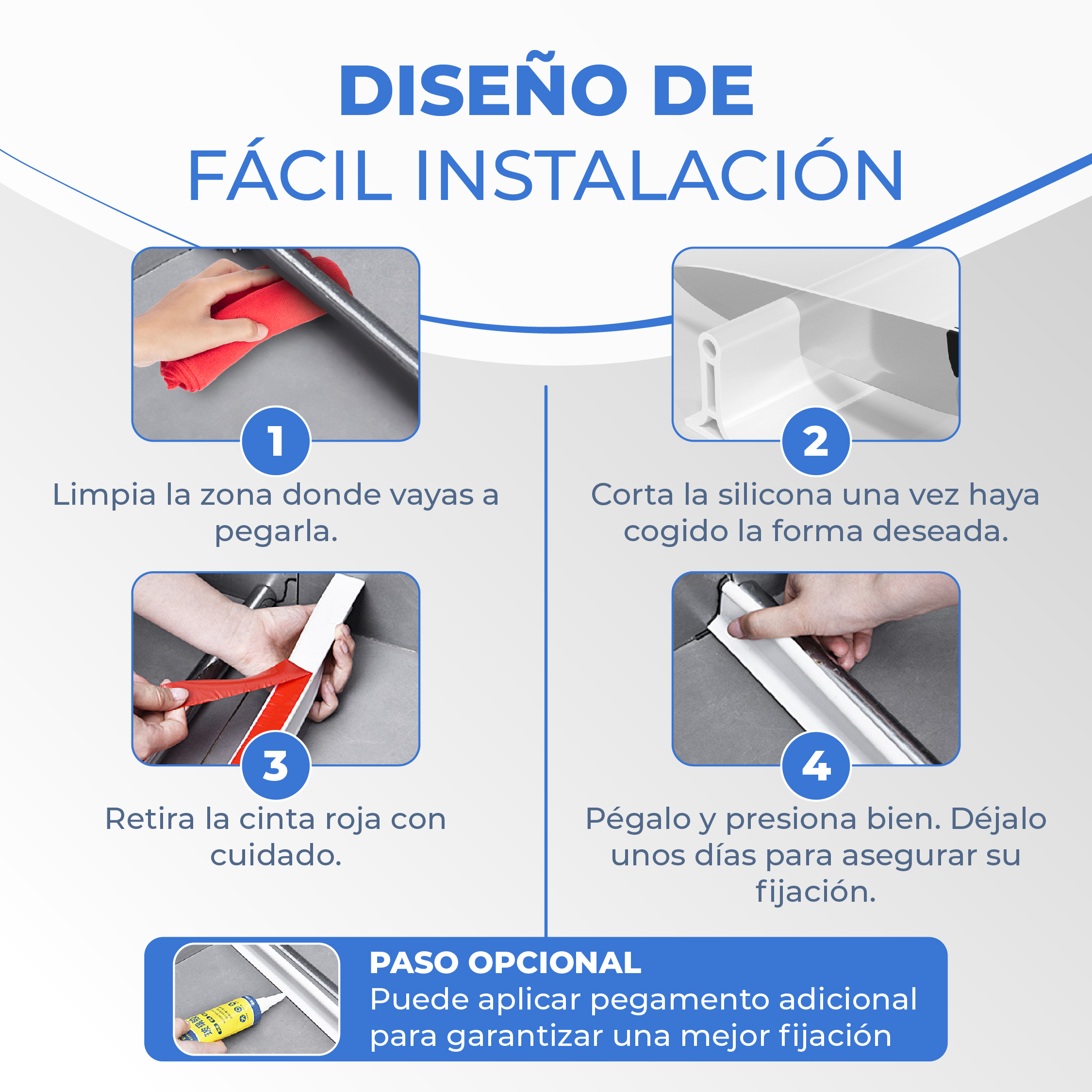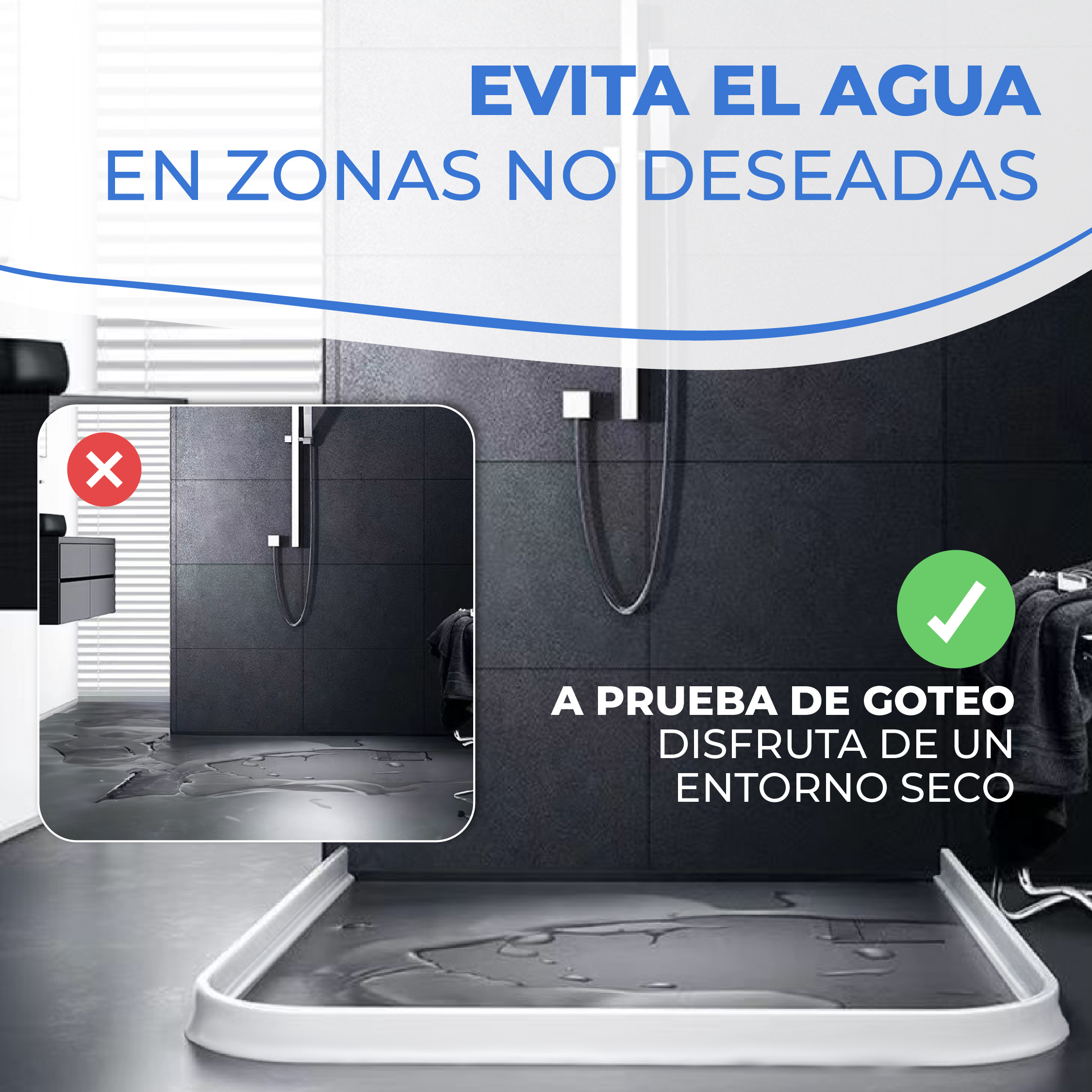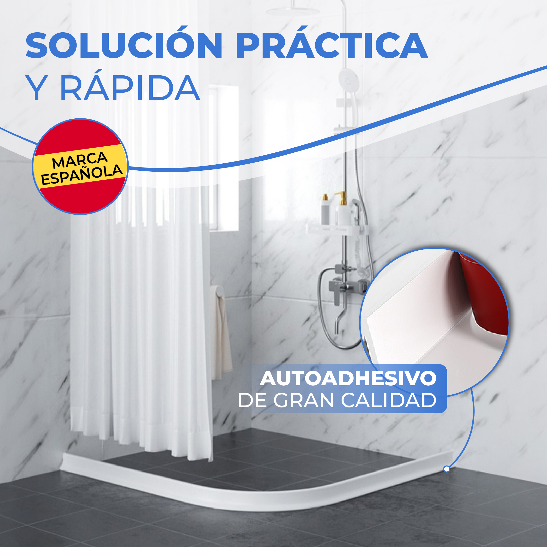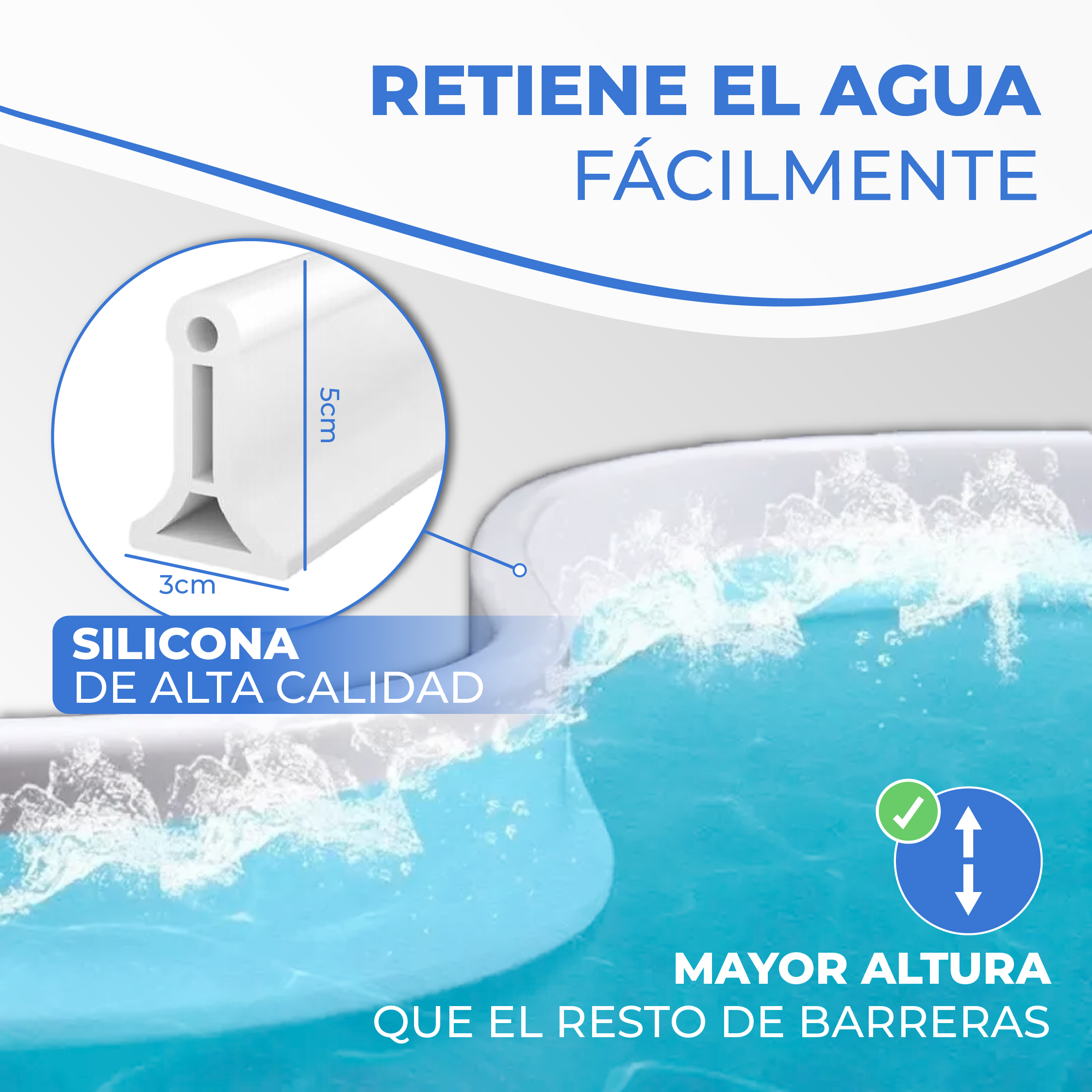 Hecha con silicona de alta calidad, es flexible, duradera y muy fácil de instalar. Su diseño elevado actúa como una pared suave que detiene el agua sin causar tropiezos.