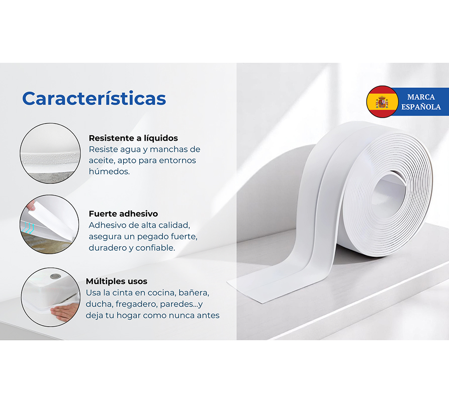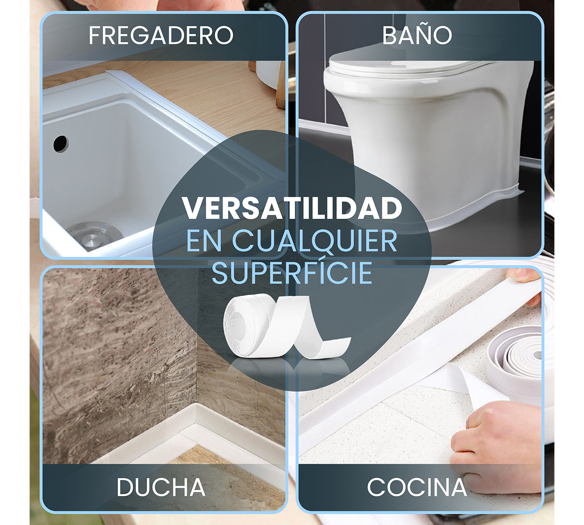 Esta versión mejorada de nuestra cinta selladora incluye 3 rollos con mayor resistencia al agua y durabilidad prolongada. Diseñada para proteger áreas expuestas a humedad constante, como duchas, lavabos, encimeras y bordes de bañera.